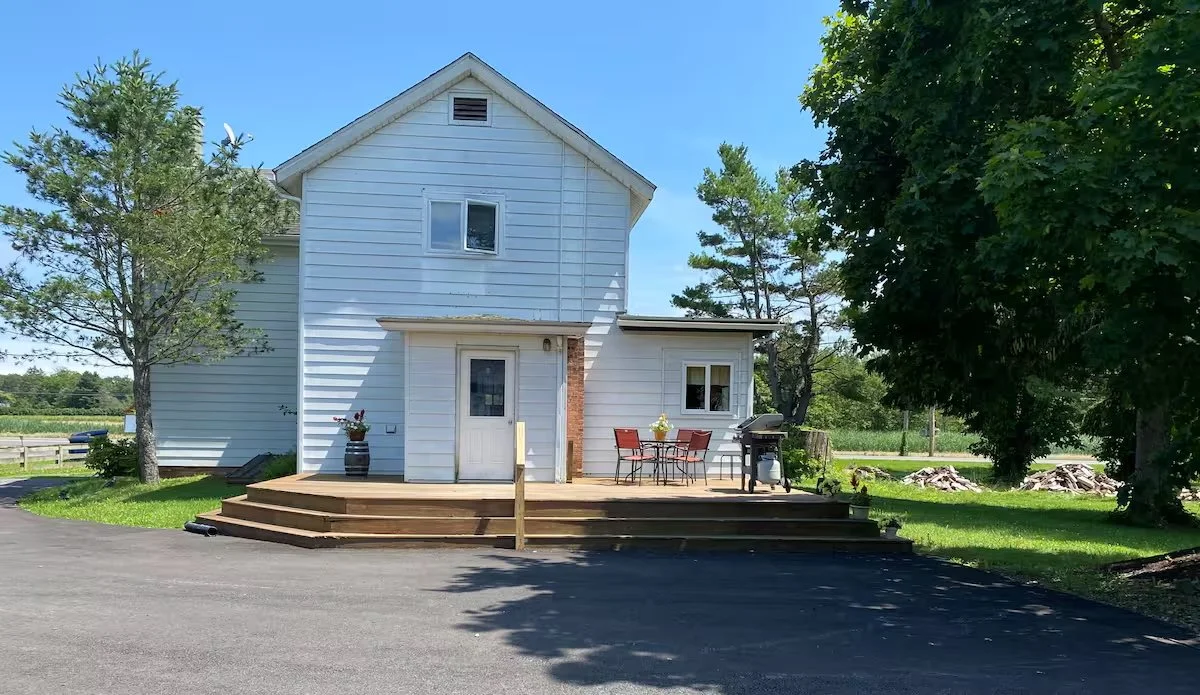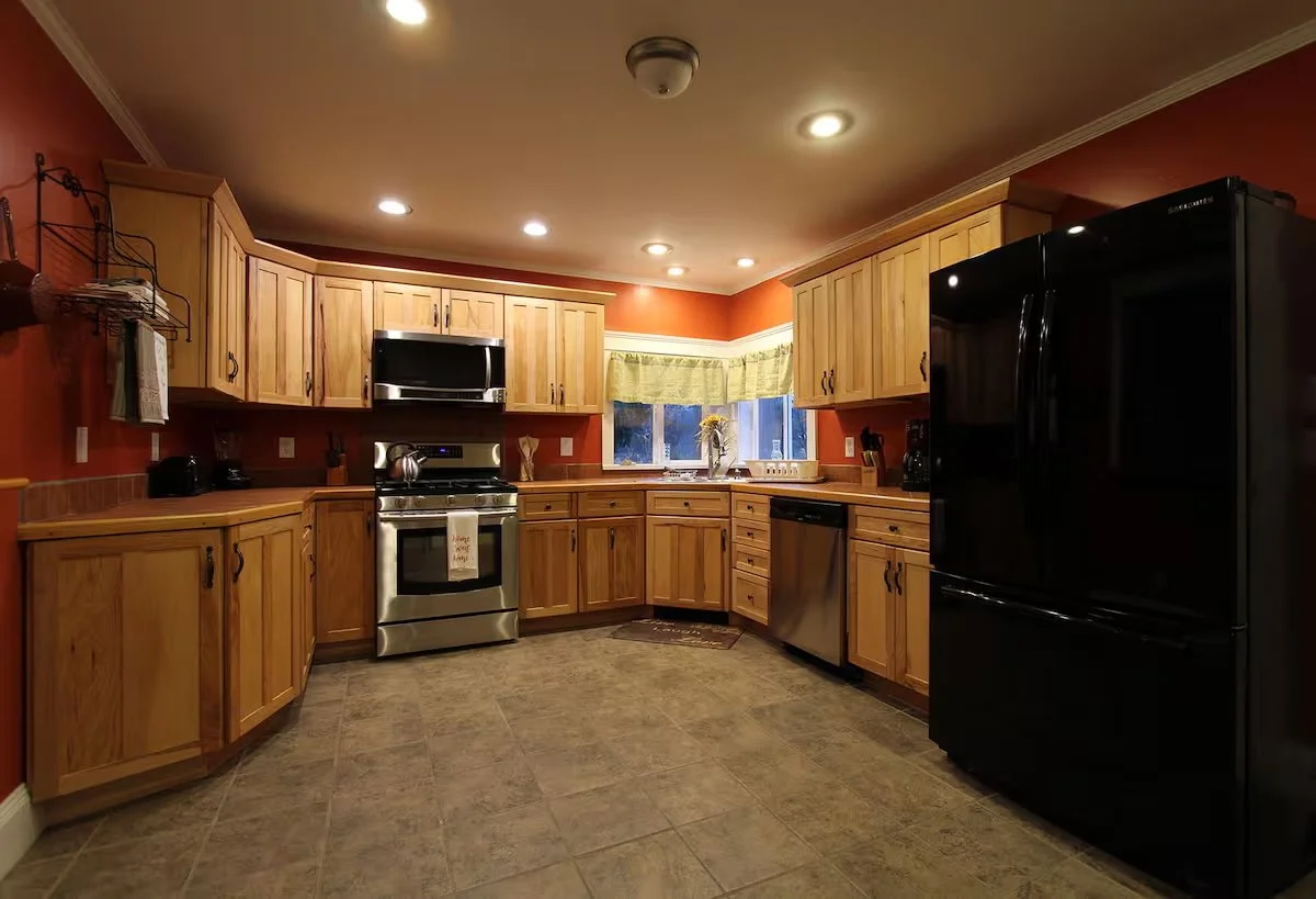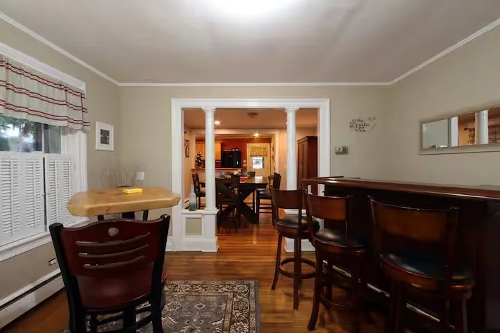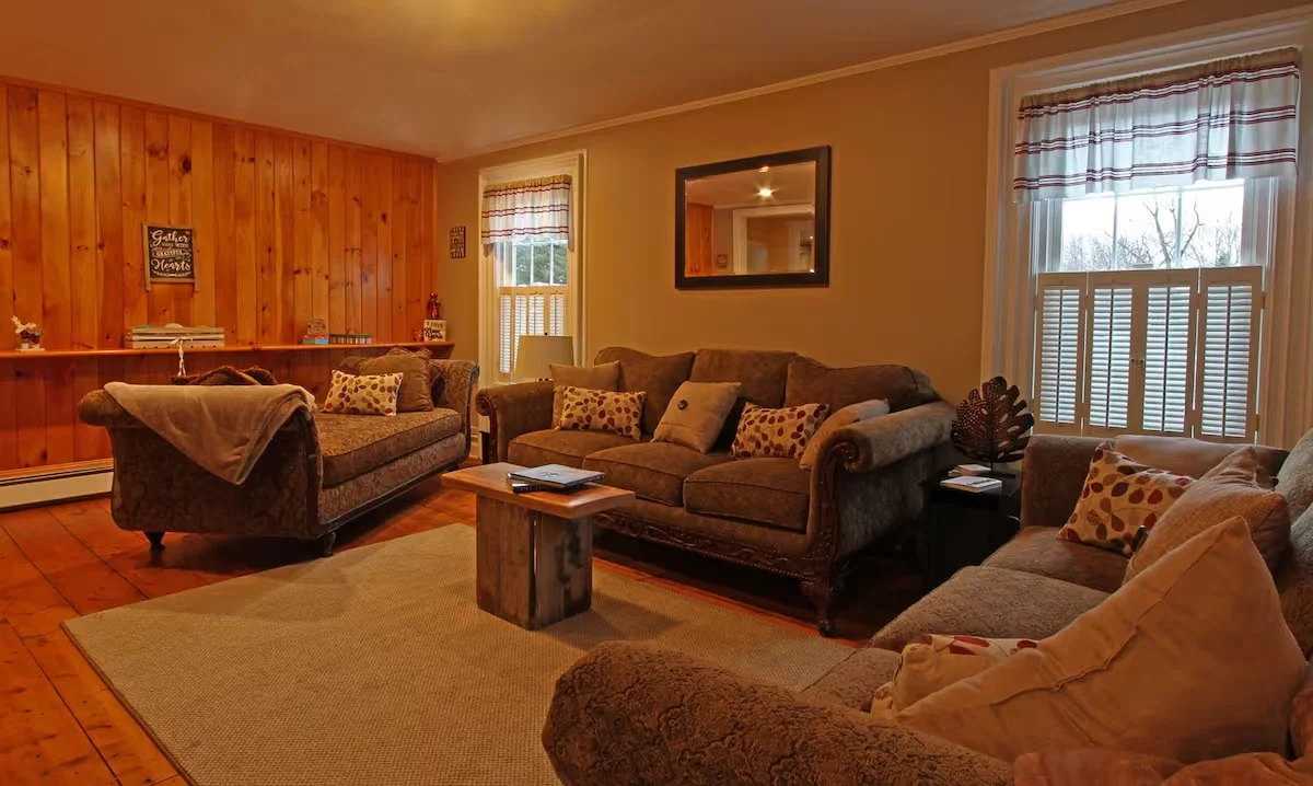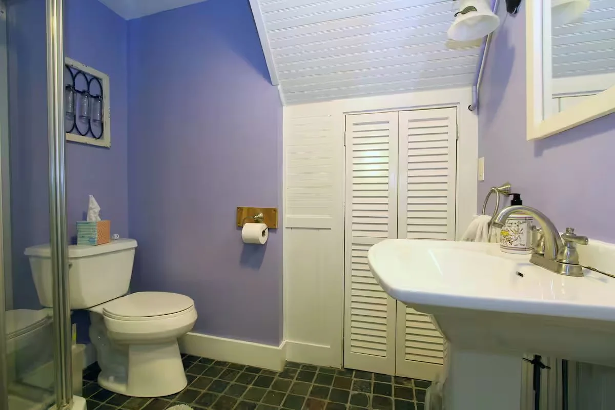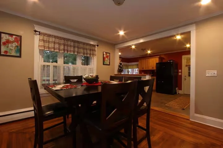 The communal spaces of the house are largely on the first floor with a fully equipped kitchen with propane stove, microwave, toaster, pots, pans, coffee pot, electric kettle and refrigerator. Dinning room, living room, sitting room connected to the out door covered deck, and first floor full bathroom. Their is also communal restroom on the second floor with an extra large bath tub with adjustable shower head.